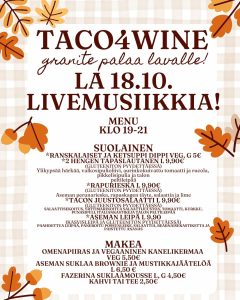 Granite nousee Taco lavalle la 18.10. Loput ovelta 10€ Keittiömme avoinna 19-21 Baari palvelee ennen ja keikan aikana janoisia asiakkaita! Nähdään keikalla!