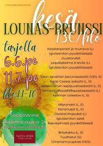 TACO4WINE kesässä on paljon ihania ja maukkaita kohtaamisia! 6.6. ja 11.7. tarjolla KESÄN lounas-brunssi klo 11-16,00 hintaan 13€ Olemme kesälaitumilla seuraavasti: to 12.6. – su