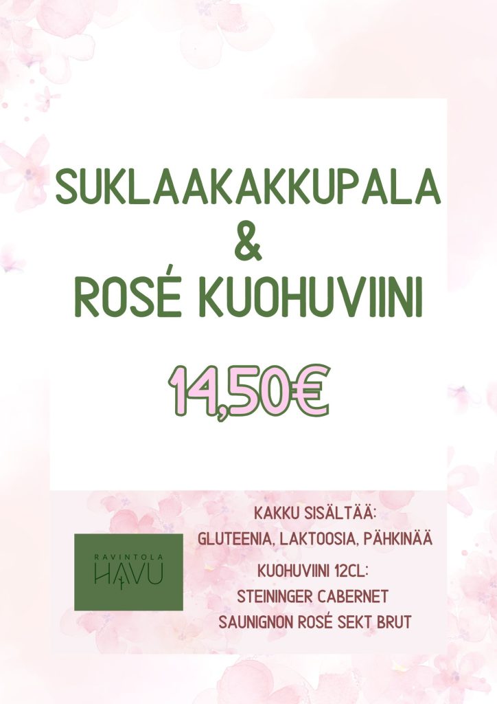 Tarjolla maukas suklaakakkupala ja Steininger Cabernet Sauvignon Rosé kuohuviini lasillinen yhteishintaan 14,50€