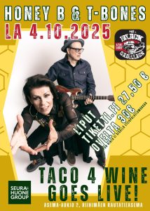 4.10. Honey B & T-Bones TACO GOES LIVE! Osta liput ennakkoon tiketistä: https://www.tiketti.fi/honey-b-t-bones-taco-4-wine-riihimaki-tickets/107233