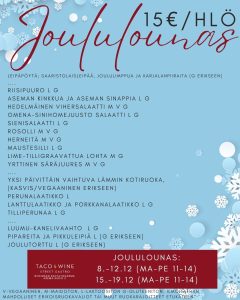 ASEMAN JOULU JOULULOUNAS: 8.-12.12 (ma-pe 11-14) 15.-19.12 (ma-Pe 11-14) 15€/hlö Pöytävaraukset kaiken kokoisille seurueille soittamalla ravintolan aukioloaikoina: 019 716 2720 tai sähköpostilla taco@seurahuone.fi