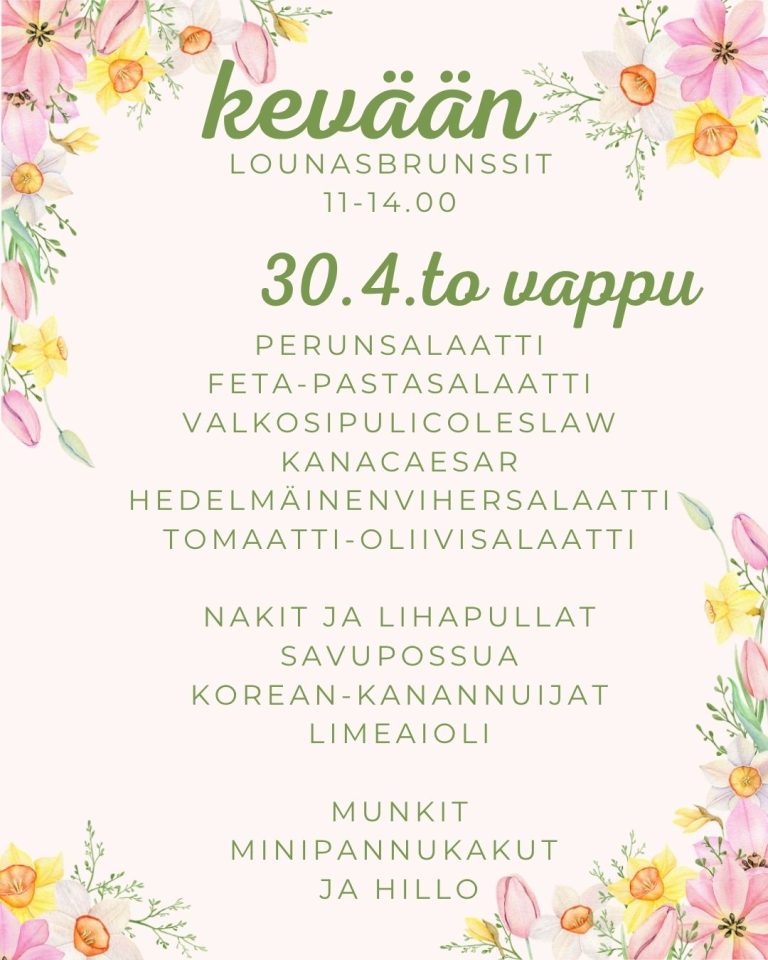 30.4. torstai VAPPU 14€/hlö ”’ Perunsalaatti Feta-pastasalaatti Valkosipulicoleslaw Kanacaesar Hedelmäinenvihersalaatti tomaatti-oliivisalaatti ” nakit ja lihapullat Savu-Possua Korean-Kanannuijat limeaioli ” Munkit minipannukakut ja hillo